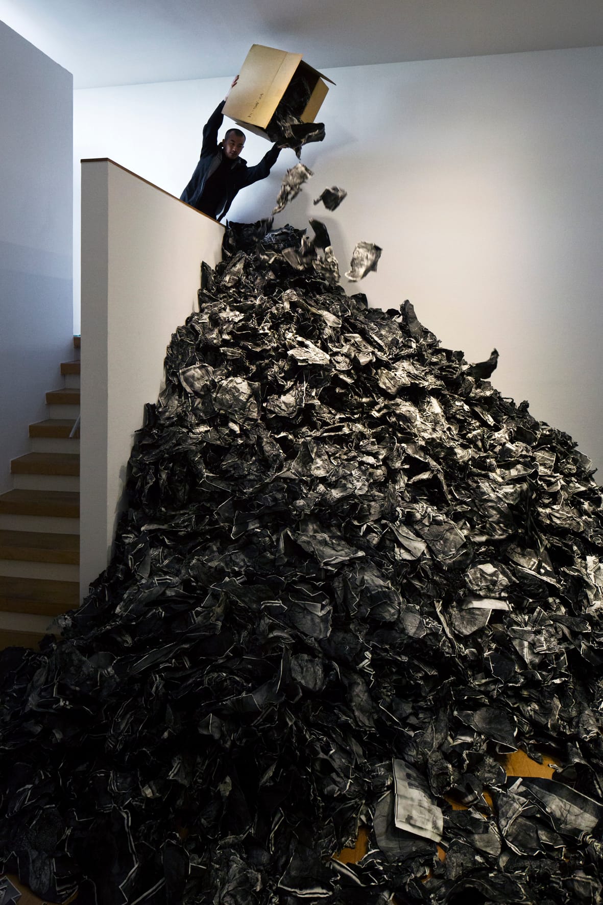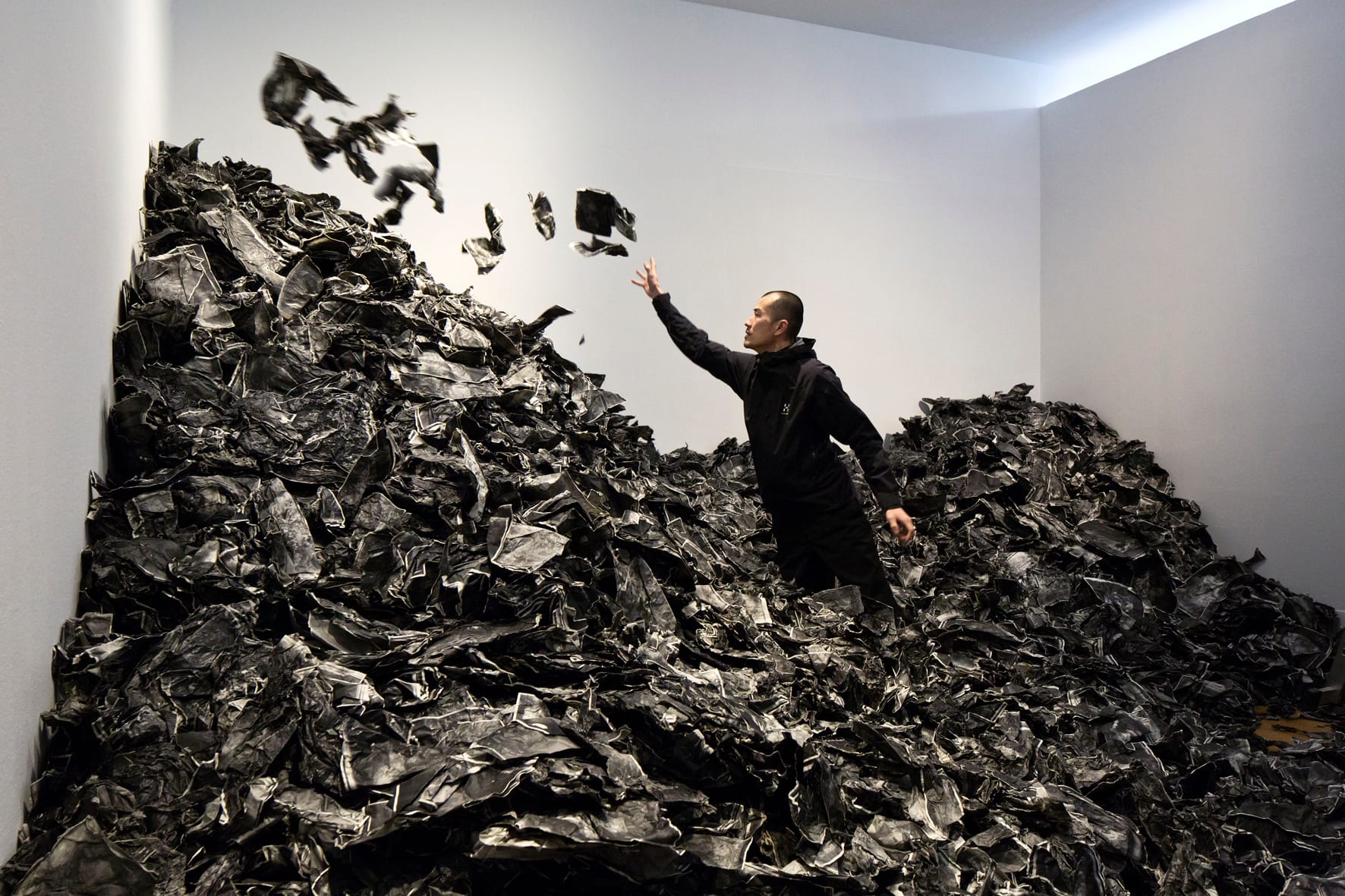 In his latest work Matter / Burn Out, Yokota sets fire to his own installation prints at an abandoned construction site in China. The resulting heaps of burnt material are documented by his camera and the images are recycled into a new autonomous artwork in the installation Matter / Vomit. The exhibition room filled with burnt matter reflects on the overflow of images we are confronted with on a daily basis and the growing indifference among recipients. Every day vast amounts of images are uploaded onto the Internet, but there are limitations to our ability to digest the incoming information. With this installation Yokota critically reflects on the limitations of our collective memory in today’s information society.